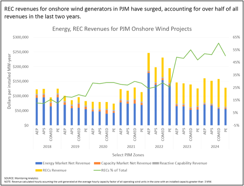 Wind farms across the PJM grid are reaping a financial boost from soaring REC revenue, with the credits making up as much as 60% of total income over the last couple years, a figure that is more than double the historic norm.